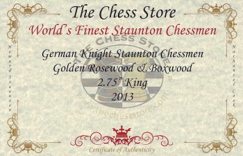 Description : SAVE $10 WHEN YOU PURCHASE THIS COMBO COMPARED TO BUYING PIECES & BOX SEPARATELY!If you're looking for a great deal on a set of high quality Staunton wood chess pieces and wood storage box combo, look no further because you found it. Simple is often best and our German Knight Staunton Chess Set with its simple and attractive design is the ideal set for your everyday chess game. Unencumbered by fine detail, these chess pieces will stand up to the rigor of regular play. This chess set features a 2.75" tall king with a base diameter of 1.125", an ideal size for casual games at home. Pieces have thick green baize pads for a soft feel on the chess board and are nicely weighted for stability. The golden rosewood has rich golden-brown colors and a beautiful grain while the cream colored natural boxwood is the perfect wood for the white chess pieces. The pieces are individually hand polished and lacquered to a beautiful shine. We include 2 spare queens for pawn promotion and a certificate of authenticity so you will always know what the chess set is, where it came from, and when it was made. More chess games have been played with a German Knight than any other chess set in the world and it continues to be our number one selling chess set.This attractive walnut chess box is perfect for storing your golden rosewood chessmen. This is a traditional chess box that is designed for stacking or laying your chessmen on top of each other and there's plenty of room. It has an old world-charm with its lock and key for securing the lid and emerald green baize interior with a divider in the center for separating the two chess piece colors. This is an inlaid wood box with high quality walnut veneer on the outside and sealed with a satin polyurethane finish. The lock and recessed hinges are brass plated and have a rich looking gold-color mirror finish. The bottom of the box is covered in with black felt to protect furniture where it might sit.Chess Pieces: Golden Rosewood & Boxwood Pieces individually hand polished with solid lacquer buffing wheel King Height: 2.75" King Base: 1.125" King Weight: 1.5 oz. Chess Set Weight:24 oz. 2 spare queens are included for pawn promotion Green Baize Cloth Pads Certificate of Authenticity Recommended Chess Board Size: 1.5 - 1.75" Squares (chess board not included)Chess Box: Material: Walnut Veneers & Other Woods Lining: Thick Green Baize (same material as the pads on the chess pieces) Finish: Satin Polyurethane Brass Plated Lock and Hinges (includes 2 keys) Outside Dimensions: 8.25" x 5.625" x 3.75" Inside Dimension: 7.25" x 4.5" x 2.5" (.75" space above in lid)Online Order for German Knight Staunton Chess Set in Golden Rosewood and Boxwood with Walnut Box - 2.75 King